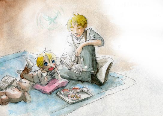 お茶とお菓子を用意したら 話して聞かせてフェアリーテイル ******** 長らく線画のままほったらかしだったのですが、 久しぶりに水彩絵の具引っ張り出してきていろ塗りしました。 水彩画は楽しいな!水彩画のハウツー本(?)を見てによによしております。 あああこんな風に描けるようになりたいんだぜ!! ていうかこの手の本の 匂 い が 好 き だ ああ新しい本のインクの匂い・・。 そういえば。ルートヴィッヒさんのことを、ルーとかルーディーって呼ぶの萌えるよな!! って一人でによによしてました。 幼少時(?)はギルとかにルーディー呼ばわりされて可愛がられていればいいんだ!! ギルベルトはなんか、不良兄ちゃんみたいなイメージで。年の離れた弟(?)にはめっちゃ甘い。みたいなな!ギル!って呼ばれてればいいんだぜ!! MOUSOU大好きー!!! 幼少時っていっても私の妄想のなかでは12~4歳くらいだけどなルーディー!!(おから は じぶん に ちゅうじつだ !) とおもったら、各国の名前の愛称を調べていらした方がいたらしく! ルートヴィッヒの愛称はルッツだって!それも可愛い!!! だれかルッツとギルでマンガか小説・・・おながいします・・・ テンション振り切ったら自分でかくかも! 全然ドイツ史とかわかんね(^o^)/だから100パー妄想になるけど! |
