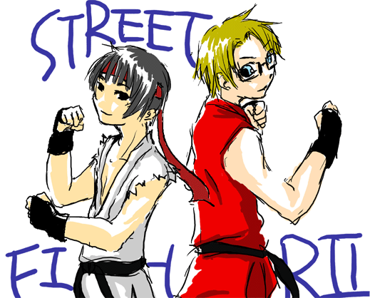スペイン兄ちゃんは癒し系。 若フランスもいいなぁ・・・カワエエ。変態だけど!! ヘタリアは国だから、色々なメディア(?)とのダブルパロが楽しいなぁと思います。 楽しいのが自分だけじゃないといいなと思いつつ、妄想の赴くままにがりがりやってます。 ちゅーわけで。ストリートファイターに手をだしましたw ****************************************************************** 「・・・ねぇ日本」 「なんですか。」 「もしかしてゼンザっていうポジションじゃないかい俺たち。」 「よく気がつきましたね。」 「いやこれだってどうかんがえてもらくがk・・・・」 「じゃあアメリカさんはあっち側に行きたかったんですか?」 「・・・・・・・・。」 「まぁ、我らが兄達に花を持たせてあげようじゃないですか!」 「・・・そうだな!!」 ****************************************************************** と、いうわけで、察した方もいるかもしれませんが、女装とも女体ともつかない二次元万歳な感じの兄たちがいます↓ |