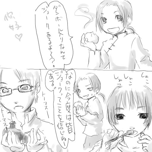 でもこれマンガって言わない気がするよ!! 軽く中国語をシカトする日本が描きたかっただけなんだよ!! 妄想の中ではもっと面白い話だったんだけど、全然だね! ・・・うん!現実では良くあることなんだよ!そんなのしっt・・・r・・(略) 文字が横書きだけど、普通のマンガみたいによんでくだされ。読みづらいな・・・。 英語間違ってたら笑ってやって!!! 最近ひぐらしのなく頃にを貪欲に見てるんだぜ!! ひまさんのところでで紹介されてた歴史替え歌に混ざってた「YOU」を探して行き着いて、なんとなく見始めちゃった・・・; しかしあの組曲すごいな!つい何度も見ちゃうよ!! 日本はこの空を~で切なくなっちゃった☆ 零戦!!零戦?! 本家、イタリア軍服をちゃんと着たヴェネがかっこよくていいー!!! なんかこう、たまに凛々しいとおねえさんキュンとくるよ!! |