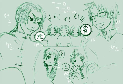 何気なくテレビ見てたらやってたんですが。 スーツマン達がドルドルゲンゲン言い争っている姿に非常にもえますた。 ヨーロッパ勢のユーロ!ユーロ!コールもちょうかわいい。 見る機会のありそうな方は是非。 んで勢い余って当然のようにヘタリアで置き換えた。 |