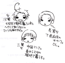 あと二本くらい描いたから、追々アップしようかなと思います。 痛いのはわかってるんだぜ!! キャストは以下の通り ちなみに描いてる本人は長男ポジ。 この後しばらく体液が二人の間で流行した。 |