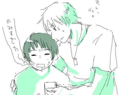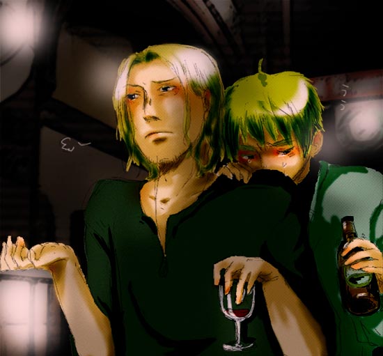 DVD、買おうかどうしようかまだ悩み中。。 収録時間の割に、割高だよね?って思うのは私だけか?? 特に初回版。。 ああでも2巻だけは初回版でほすぃかも。まるかいて地球by日本とイギー・・・。 自分で英日供給しようとして落書きしたらここ最近お酒のことばかり考えていたせいか、見事に反映された絵になっちゃったYO! 酒飲みたい。 今日ファミマで、ボトル缶に入った日本酒を見かけたけど、あれっておいしーのかな・・ちょっと興味が湧いたんだけど、弁当代節約してるのに酒買うってどうなの?って思って我慢したんだ・・・。 おおおでも買ってくればよかったorz っていうか、日本もなにげに酒癖悪そうだよな・・・。 東京がロンドンみたいに泥酔禁止になったらもう東京で酒は飲めないんじゃないかなぁと思いますまる。 っていうか、泥酔ってどのくらい? 千鳥足はセーフ?ろれつがまわらないとか、どうなの?? 歩けなくなったらアウトかなぁ。。 |